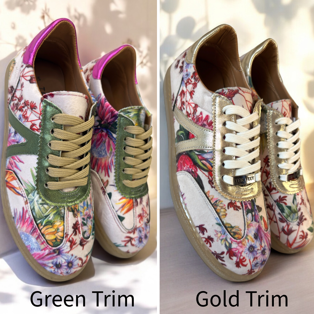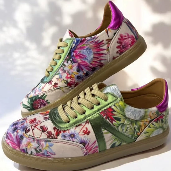 South African artist Jana Aspeling’s original paintings are transformed into bold textiles, brought to life on fashion-forward sneakers by Ten Feet — designed and made in South Africa, by women for women.