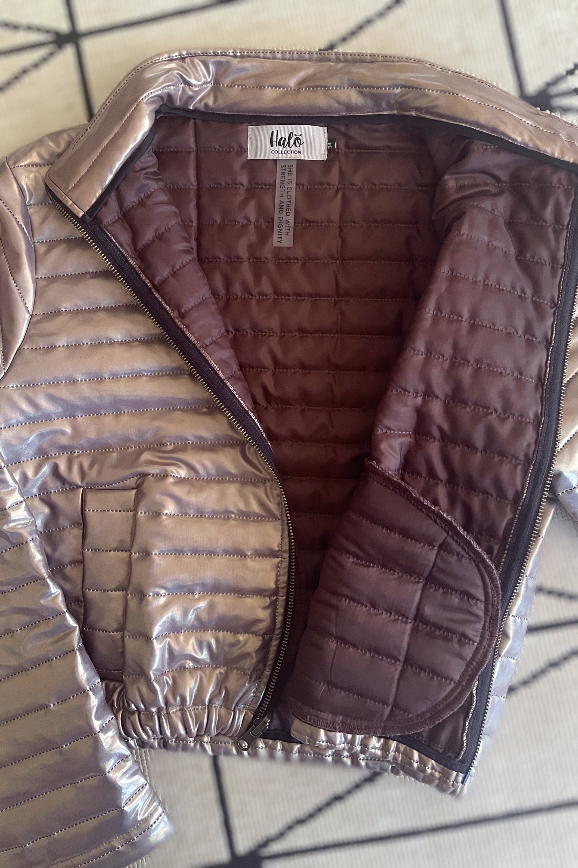 Metallics are all the rage this season. This quilted puffer fabric has a unique bronze chrome colour. (Watch the video in the product image gallery, to get an accurate depiction of the colour.)