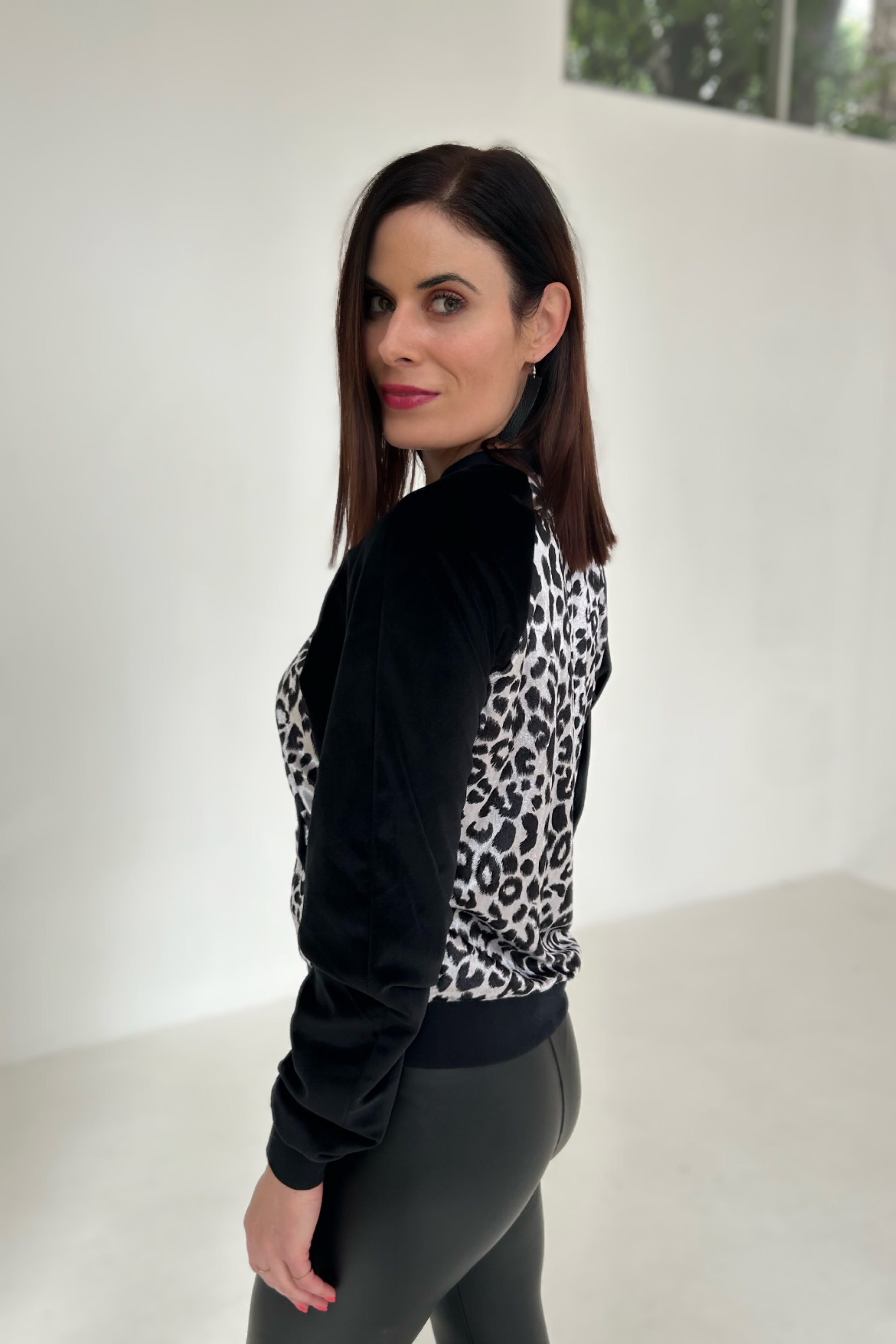 Dress it up or dress it down - leopard print velvet bomber jacket. The super luxurious black velour sleeves add a touch of elegance and comfort to this trendy piece. Plus, it's fully lined with luxurious satin.
